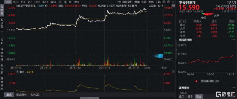 从技术面来看,公司在触及120日均线后企稳反弹,连续五日资金净流入,显示市场情绪正从谨慎转向积极。更值得留意的是南下资金的悄然布局。自10月底以来,港股通持股比例从20.75%稳步攀升至21.34%,透露出南下资金对这家医疗科技平台信心的回暖。